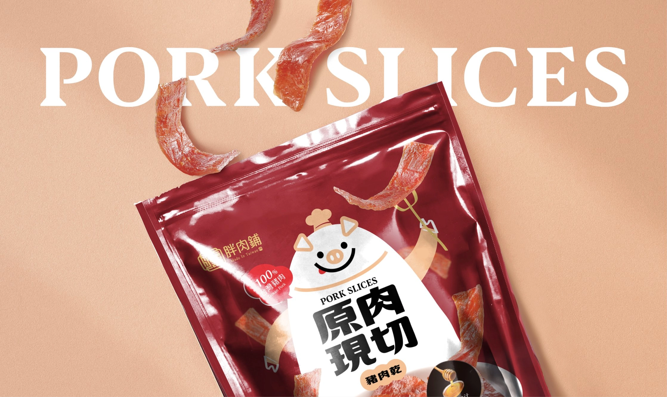 如果肉乾的美味可以被看見,那應該就是它在空氣中翻飛的樣子。 胖肉鋪豬肉乾包裝設計是一款以童趣插畫與實物影像交錯鋪陳的立袋包裝。希望在拆封之前,就讓人想像那咀嚼之間的鹹香回甘,在視覺與味蕾的記憶中同時展開,讓「原肉現切」這件事,被感覺、被期待。